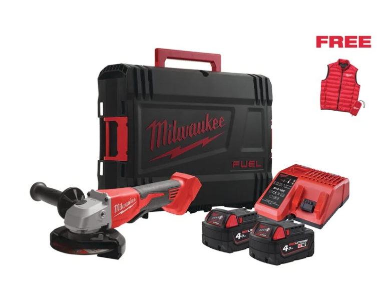 Speciální limitovaná sada Milwaukee obsahující úhlovou brusku 125 mm s kolébkovým spínačem M18 BLSAG125XPD, 2x akumulátor M18 4AH, nabíječku M12 - M18 C a kufr na nářadí. Dále sada obsahuje vestu Milwaukee.