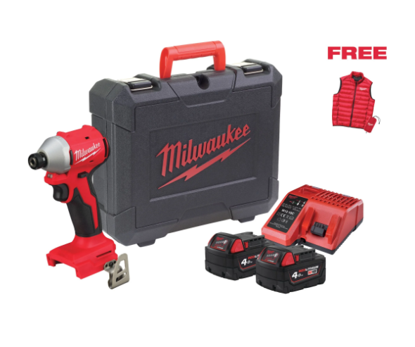 Speciální limitovaná sada Milwaukee obsahující kompaktní rázový utahovák 1/4 Hex M18 BLIDRC, 2x akumulátor M18 4AH, nabíječku M12-M18 C a kufr na nářadí. Dále sada obsahuje vestu Milwaukee.