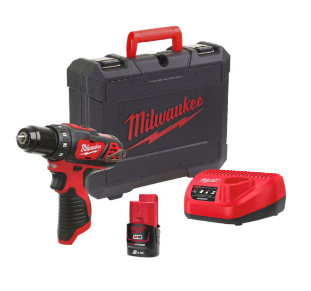 Kompletní sada vrtacího šroubováku obsahuje aku šroubovák M12 BDD, akumulátor M12 2AH, nabíječku C12 C a kufr na nářadí.