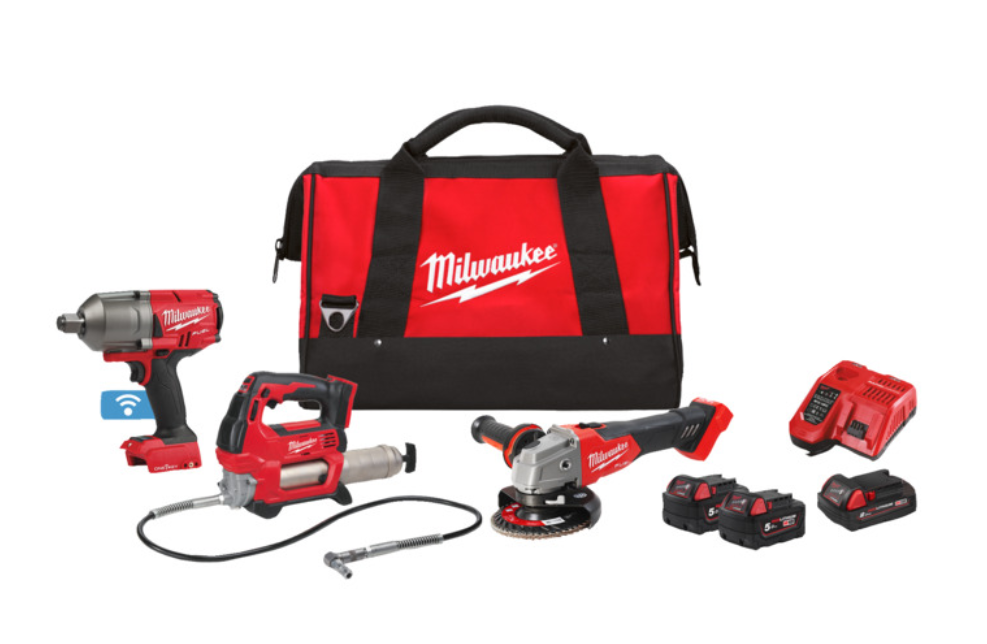 Sada nářadí Milwaukee M18 vhodná pro údržbu zemědělských strojů. Sada obsahuje rázový utahovák M18 ONEFHIWF34, úhlovou brusku M18 FSAG125X, mazací pistoly M18 GG, 2x akumulátor M18 5,0 Ah, 1x akumulátor M18 2,0 Ah, rychlonabíječku M12-18 FC a tašku na nářadí.