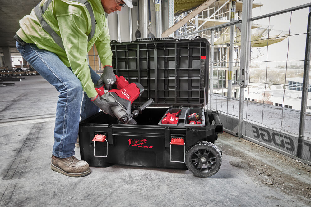 Robustní a voděodolná přepravní bedna Milwaukee PACKOUT vybavena kolečky. Bedna je součástí modulárního systému