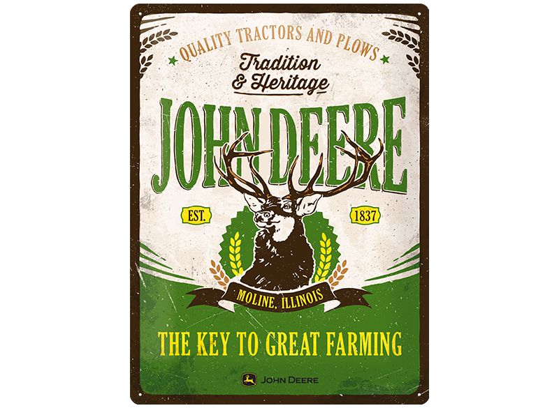 PLECHOVÁ REKLAMNÍ CEDULE JOHN DEERE "TRADICE A DĚDICTVÍ" S JELENEM