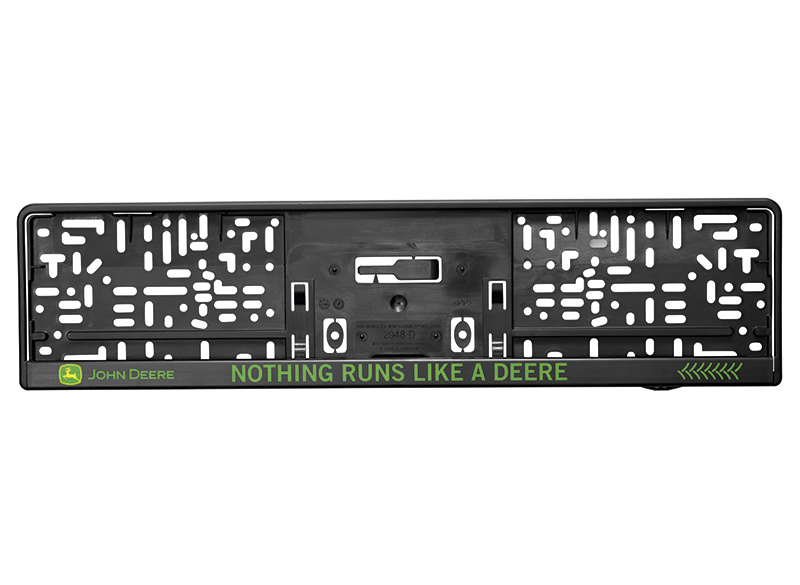 Tato poznávací značka je vyrobena z vysoce kvalitního plastu s barevným logem John Deere. Snadno se vejdou všechny standardní číselné desky (UK i EU), které mají maximální délku 52,1 cm a jsou 3 mm široké. Velikost rámu je 54,3 cm x 14,4 cm.