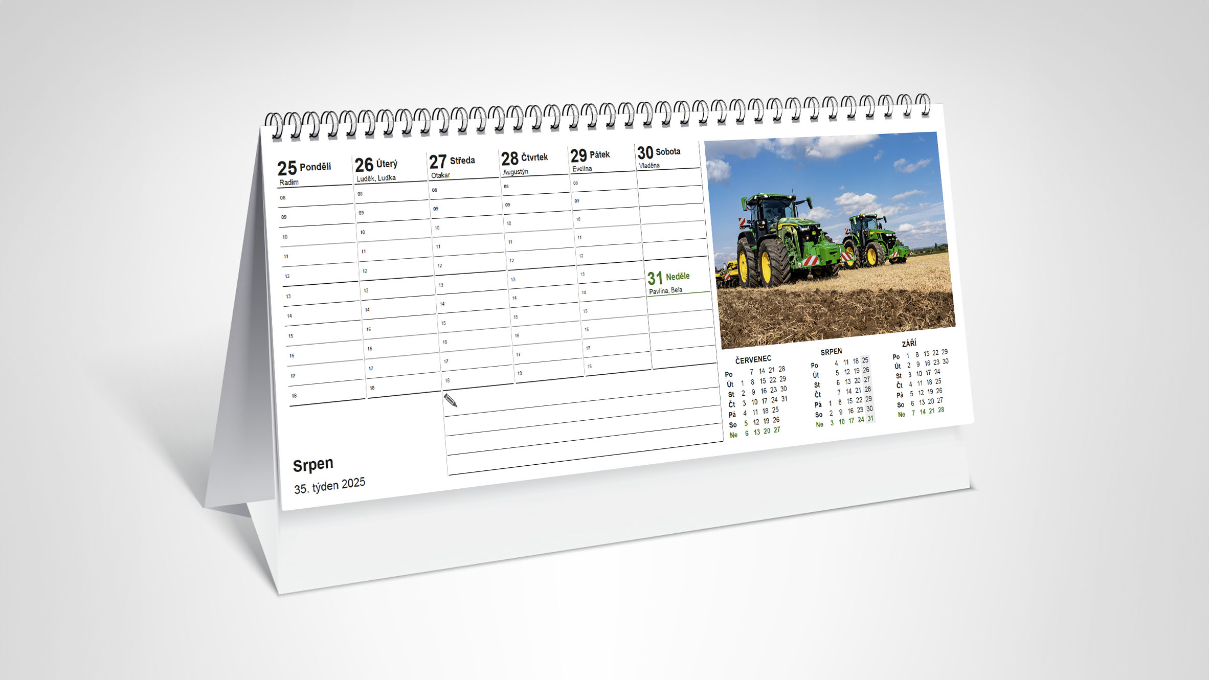 Originální stolní kalendář STROM s našimi autorskými fotkami dokonalé techniky John Deere pro rok 2025.