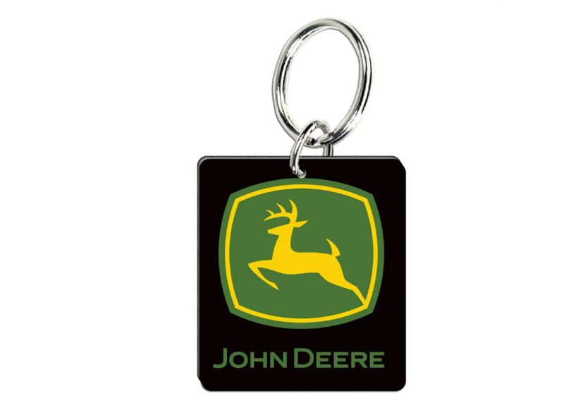 Přívěšek na klíče značky John Deere. Černý hranatý přívěsek na klíče se zeleno-žlutým logem značky John Deere.