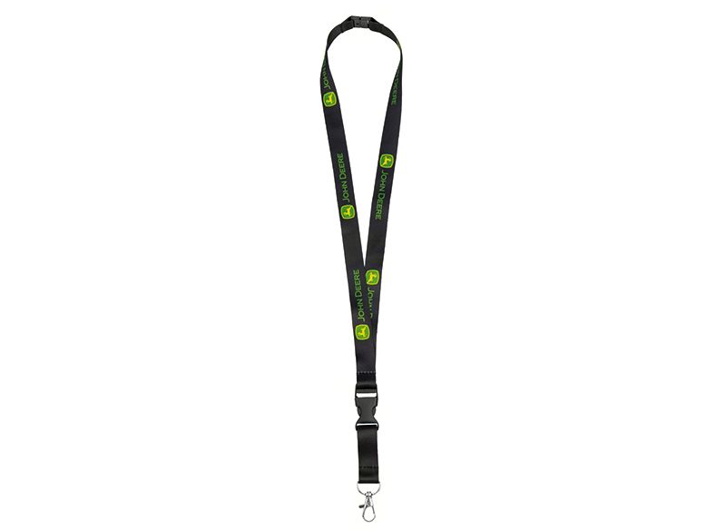 Černý lanyard s odnímatelnou kovovou karabinou a bezpečnostní sponou. Tištěné logo John Deere.