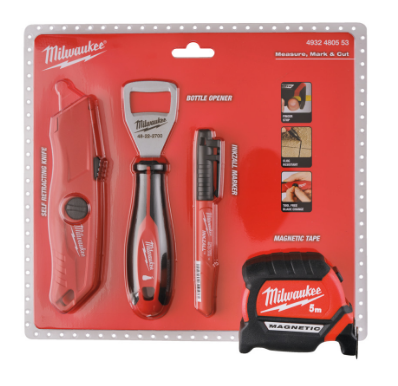 Sada příslušetnství Milwaukee obsahuje: otvírák na láhve, Inkzall popisovač s tenkým hrotem, odlamovací nůž a svinovací metr o délce 5m.