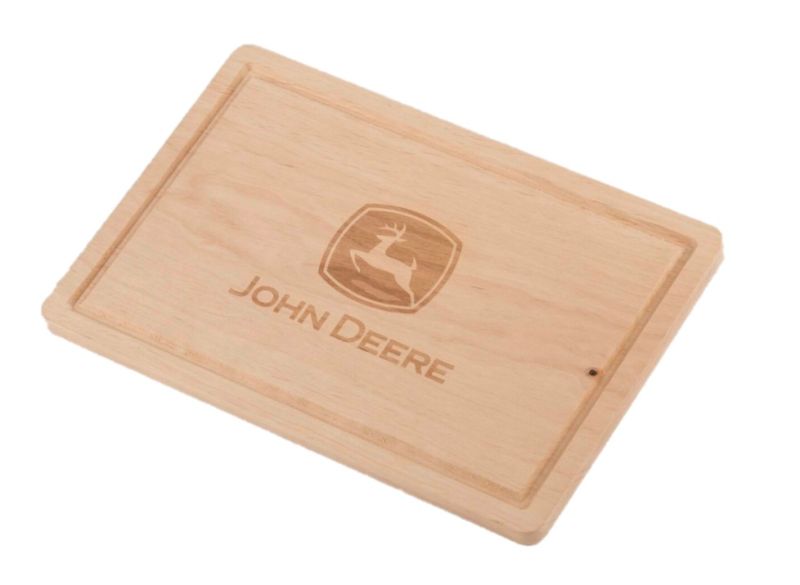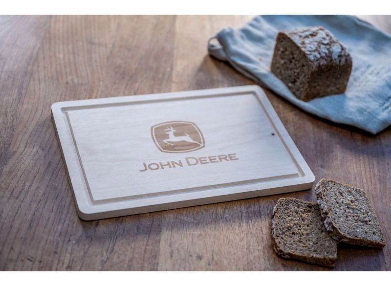 Dřevěné prkénko s laserově vyrytým logem John Deere. Před prvním použitím dřevěnou desku impregnujte vhodným olejem.