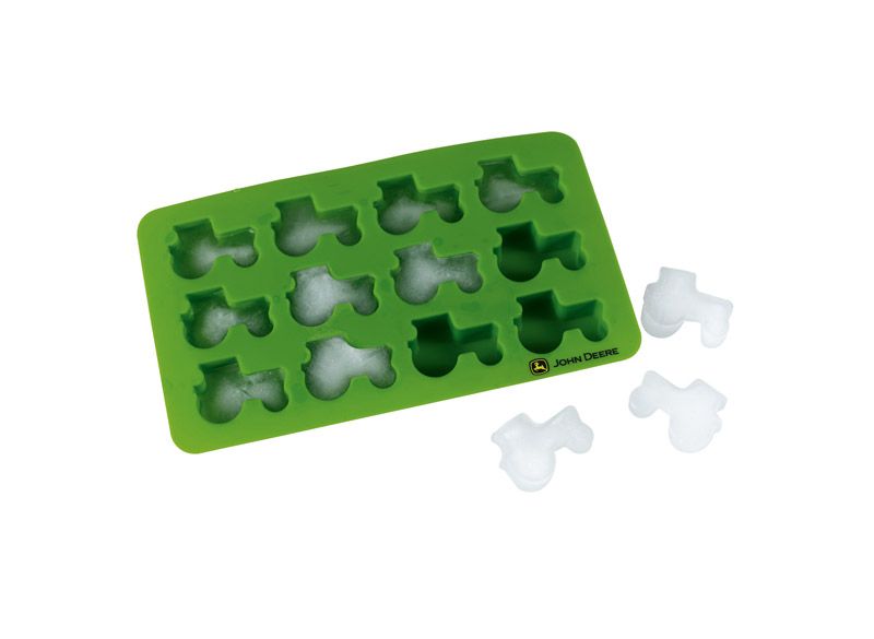 Silikonový zásobník na led ve tvaru traktoru v zelené barvě s tištěným logem.