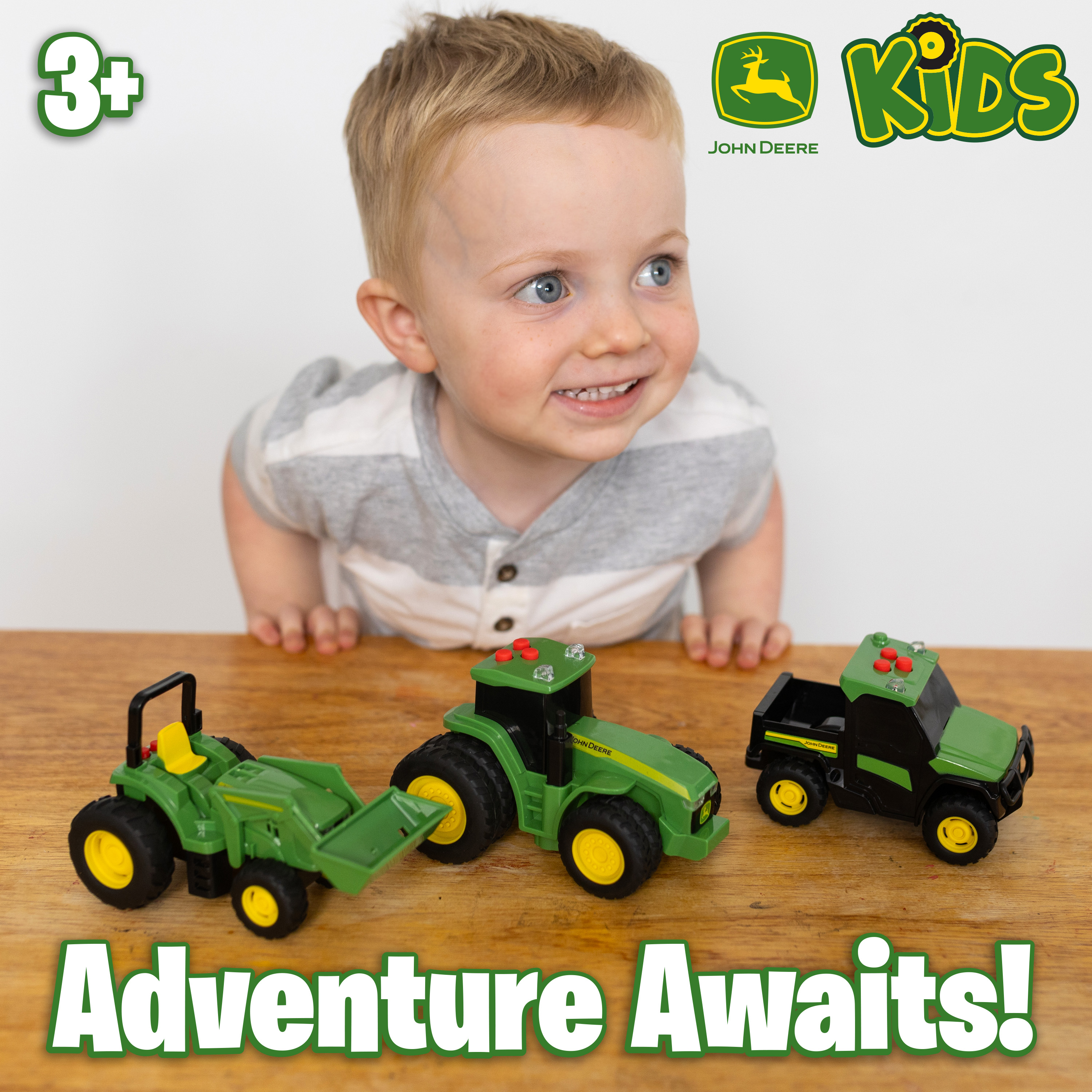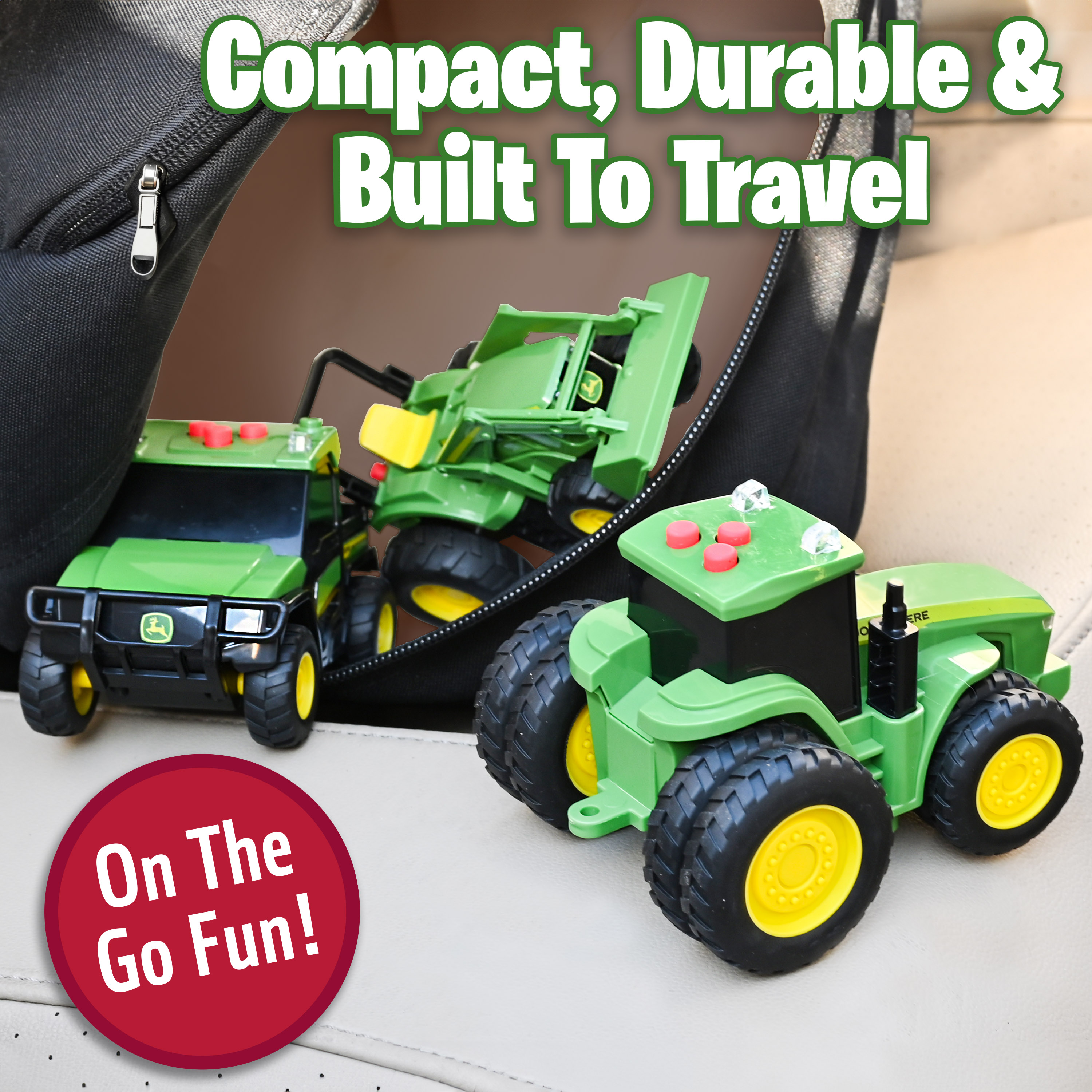 Děti mohou „orat pole“ s traktorem 7R Series, převážet náklad s modelem 6105M nebo se prohánět po náročném terénu s Gator vozidlem. Díky kompaktní velikosti (cca 12 cm) jsou tyto mini stroje ideální i na cesty. Perfektní zábava pro malé farmáře od 3 let!