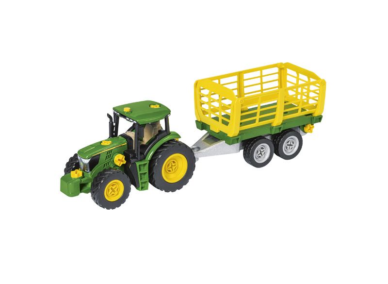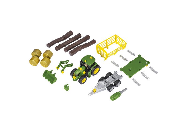 Objevte novou řadu John Deere CONSTRUCTION. Postavte si svůj vlastní traktor John Deere 6215 R v měřítku cca. 1:24. Vezměte podvozek, namontujte pneumatiky, sedadlo, kabinu řidiče a kapotu motoru. Chcete pomocí čelního nakladače naložit balíky sena na vozík na seno? Namontujte nástavec na vozík na seno na přívěs. Nebo chcete vozit dřevo? Poté přestavte přívěs na přepravník dřeva. Nezapomeňte na protizávaží na přední části traktoru.