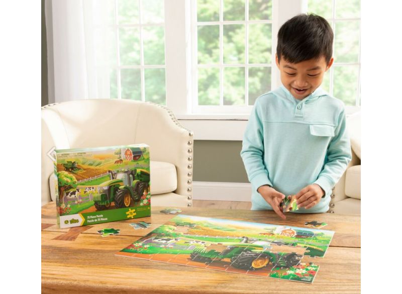 John Deere přináší dětem zábavu na farmě se skládačkou. Puzzle mají 70 dílků a na obrázku je tipická scéna z farmy John Deere. Robustní kousky jsou ideální pro menší ruce, protože zdokonalují jemnou motoriku a koordinaci ruka-oko. Tyto dětské puzzle, plně sestavené, mají rozměry 46 cm x 35,5 cm s odolnými díly, které lze znovu a znovu rozložit a složit. Perfektní puzzle pro děti od 4 let. Skvělý dárek pro děti.