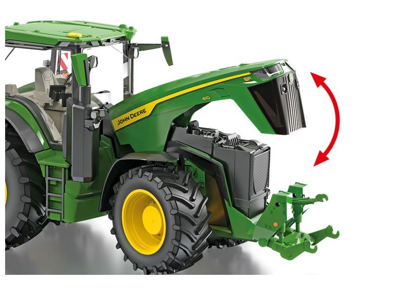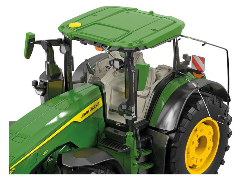 Vysoce detailní replika nového traktoru John Deere 8R 410 v měřítku 1:32 od výrobce Wiking. Model je vyroben z kovu s plastovými díly a vyznačuje se vysoce detailním provedením interiéru kabiny a četnými funkcemi, jako je otevírací kapota a dveře, pohyblivé horní/spodní rameno, otočné sedadlo řidiče a další. Možnost připojení vleček a příslušenství přes tříbodový závěs.