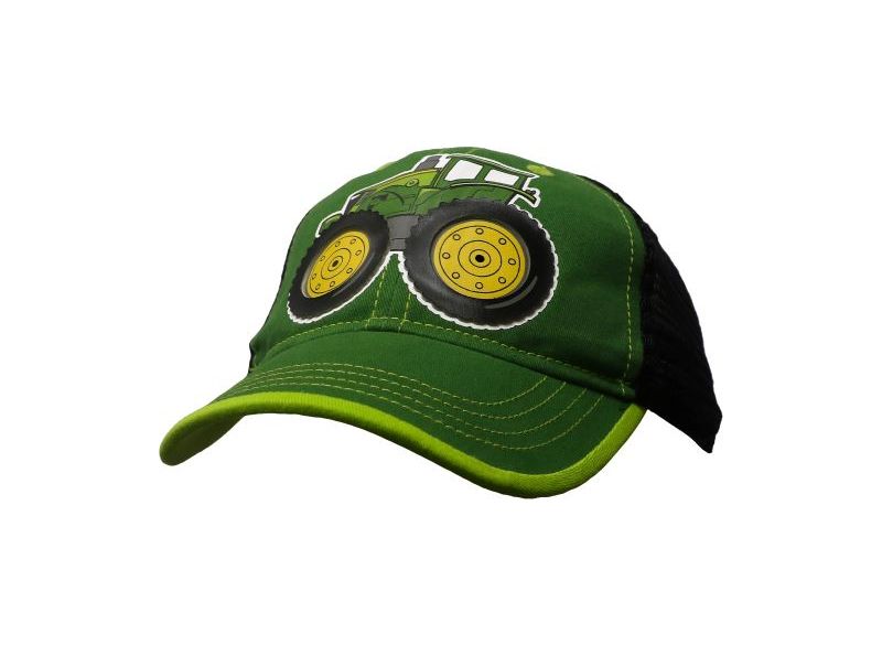 Zelená kšiltovka John Deere s velkým traktorem vepředu a černou síťovinou proti zapaření hlavy pro nejmenší děti. Nastavitelné zapínání na patentky vzadu. Perfektní pro každého malého traktoristu!