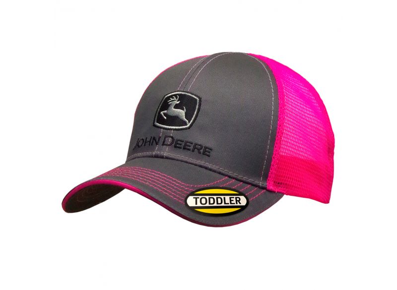 Dětská kšiltovka John Deere s otvorem na culík v růžové barvě, s nášivkou traktoru a květinovými detaily. Vyrobena ze 100% bavlny.