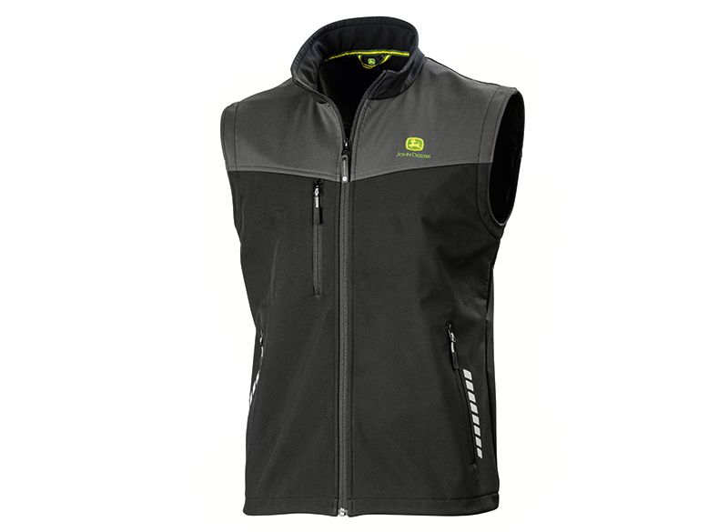 Pánská softshellová bunda se čtyřmi vnějšími kapsami a jednou vnitřní. Bunda má rukávy vyrobené z hrubé látky. Malé John Deere logo je našité na hrudi.
