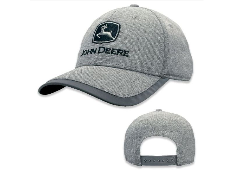 Kšiltovka John Deere zbarvená do šediva s charakteristickou výšivkou s logem John Deere uprostřed přední části a reflexním lemem na okraji kšiltu.