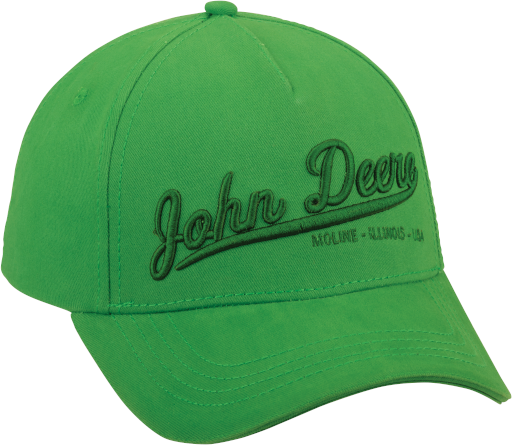 Čepice z vysoce kvalitního bavlněného kepru s trojrozměrnou výšivkou nápisu "John Deere". Uvnitř tkaný štítek. Nastavitelná velikost vzadu pomocí ražené přezky ve stříbrné barvě.