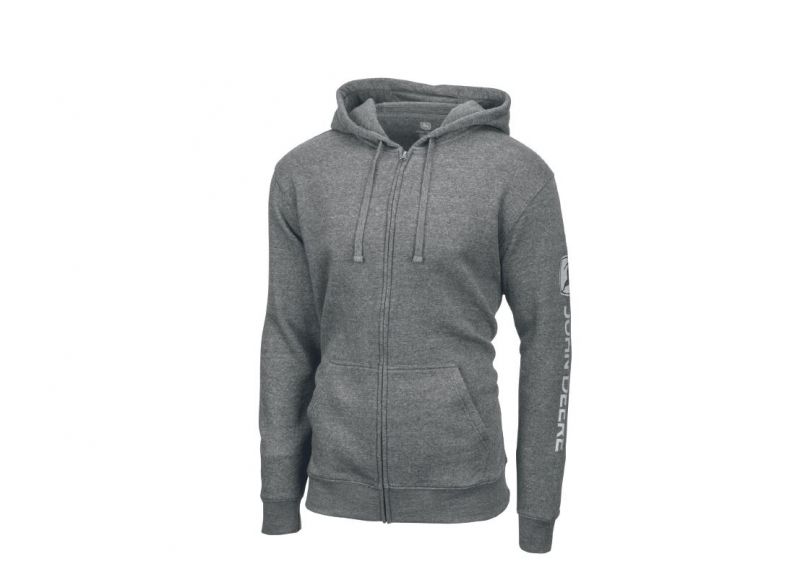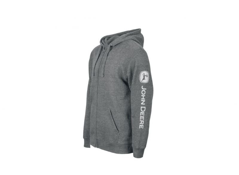 Černo-šedá fleecová mikina John Deere na zip s kapucí a sítotiskem loga na rukávu. Velikostně OVERSIZED. Pokud se chcete přiblížit své klasické konfekční velikosti, objednejte si prosím o číslo menší velikost než běžně nosíte.