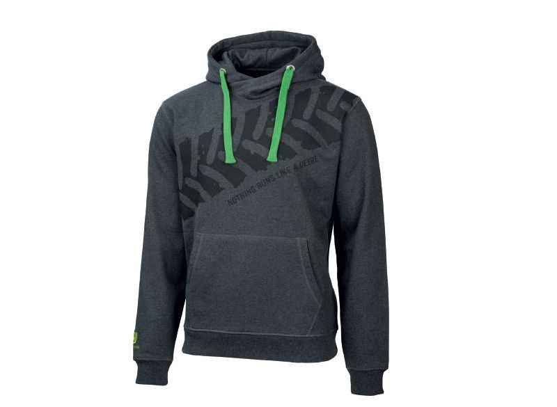 John Deere uhlově šedá fleecová mikina s kapucí a sítotiskem loga na přední straně. Materiál: 60% bavlna, 40% polyester