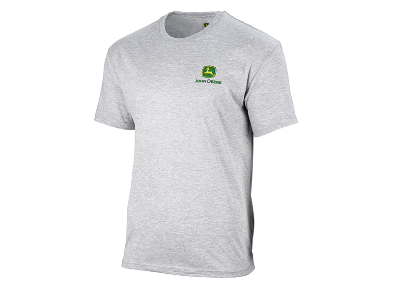 Uhlově šedé tričko John Deere s logem značky vytištěném na levé náprsní kapse. Materiál: 60% bavlna, 40% polyester