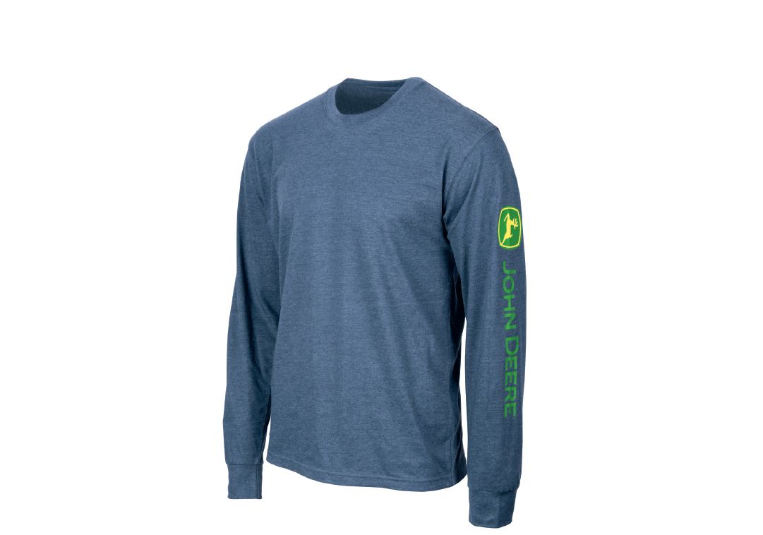 Zelené tričko John Deere s dlouhým rukávem se sítotiskem loga značky na rukávu. Materiál: 100% bavlna