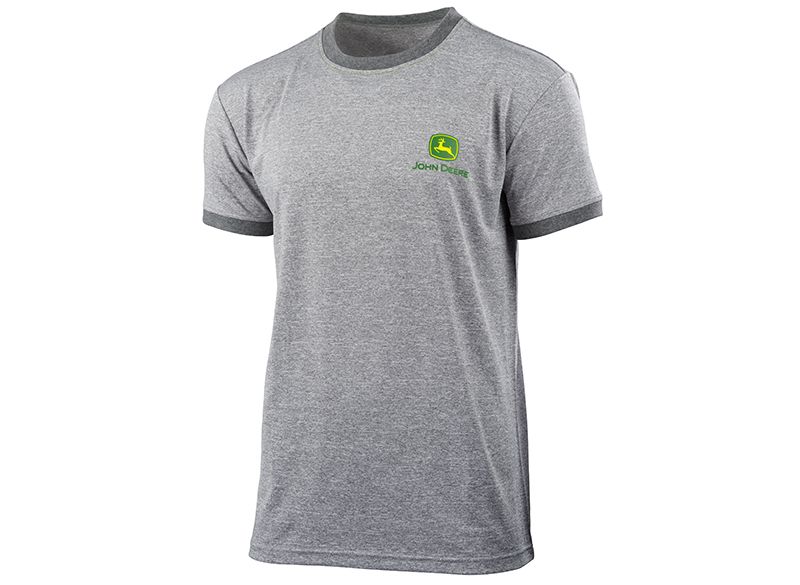 Uhlově šedé tričko John Deere s logem značky vytištěném na levé náprsní kapse. Materiál: 60% bavlna, 40% polyester