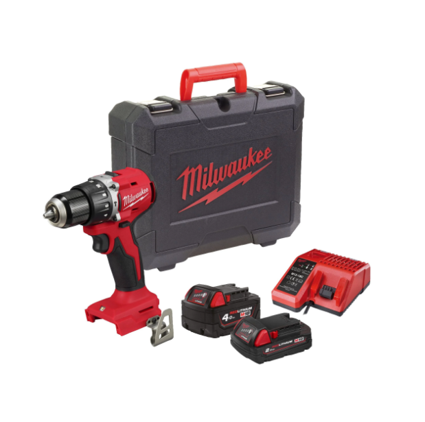 Balení obsahuje bezuhlíkovou příklepovou vrtačku M18BLPDRC, akumulátor M18 2,0 Ah, akumulátor M18 4,0 Ah, inteligentní nabíječku M12-18 C a kufr.