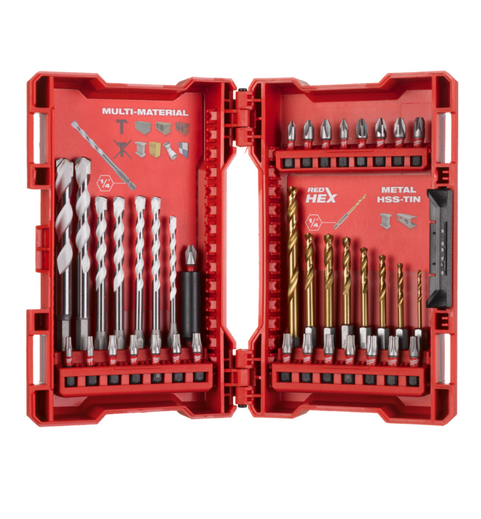 Sada SHOCKWAVE IMPACT DUTY obsahující 35 ks příslušenství (bity, vrtáky, nástrčné klíče, adaptéry). Sada je ideální pro použití s rázovými šroubováky Milwaukee.