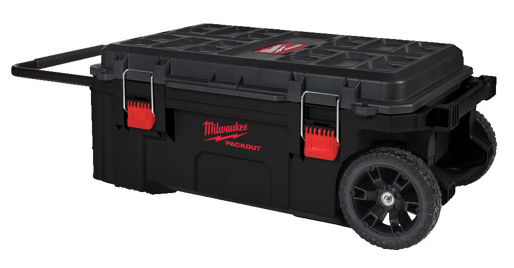 Robustní a voděodolná přepravní bedna Milwaukee PACKOUT vybavena kolečky. Bedna je součástí modulárního systému