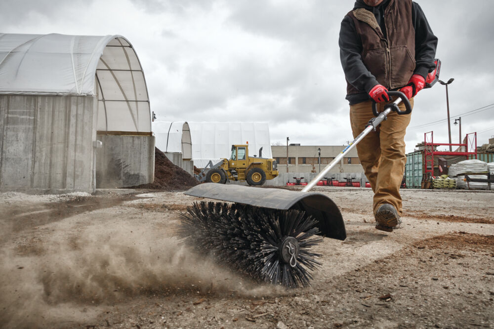 Protisměrné otáčení koštěte vrhá materiál vpřed a směrem od obsluhy