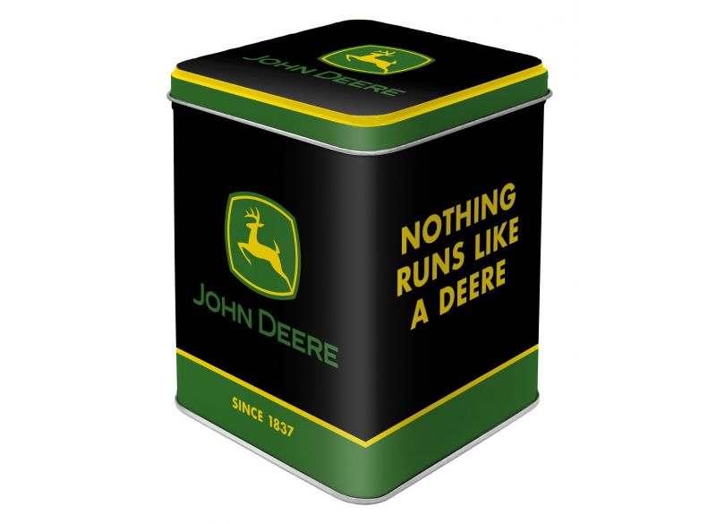 Čajová krabička „John Deere - Logo Black“. Formát 7,50 x 7,50 x 9,50 cm (délka/šířka/výška), kapacita 100 g sypaného čaje, ocelový plech, matná povrchová úprava, obraz ražený ve více vrstvách, bezpečné pro potraviny.