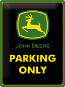 Cedule z velmi silného ocelového plechu s barevným logem John Deere a žlutým nápisem "Parking only". Zdobení pomocí reliéfu je vytvořeno do několika vrstev plechu. Vyrobeno v Německu. Rozměry: 30 x 40 cm