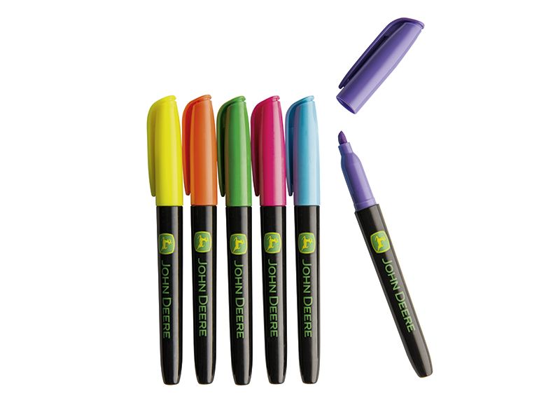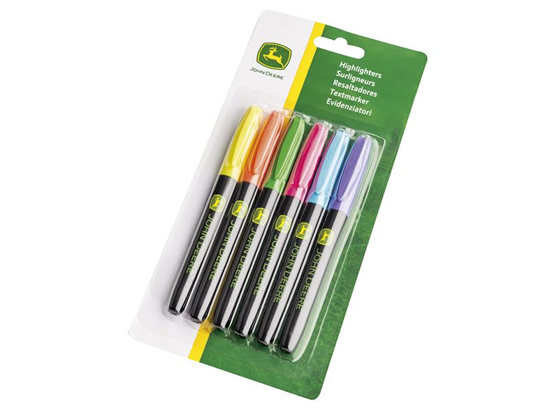 Tato sada 6 zvýrazňovačů v jasných barvách je ideální do každé kanceláře a dílny. Sada obsahuje 6 per v zelené, modré, žluté, růžové, fialové a oranžové barvě. Logo John Deere vytištěné na každém peru.