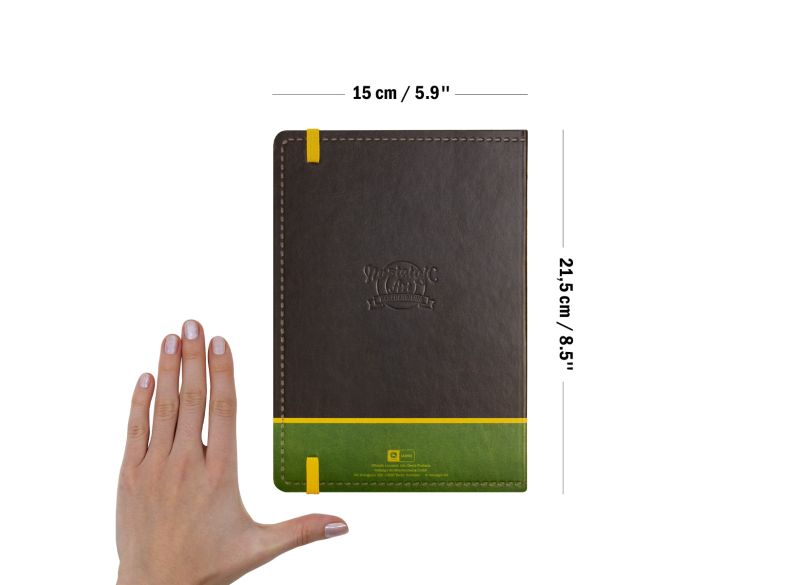 Formát A5, embosovaná pevná vazba, 128 tečkovaných stran (certifikace FSC), gumička na zavírání, barevná záložka, praktická vnitřní kapsa na volné papíry.