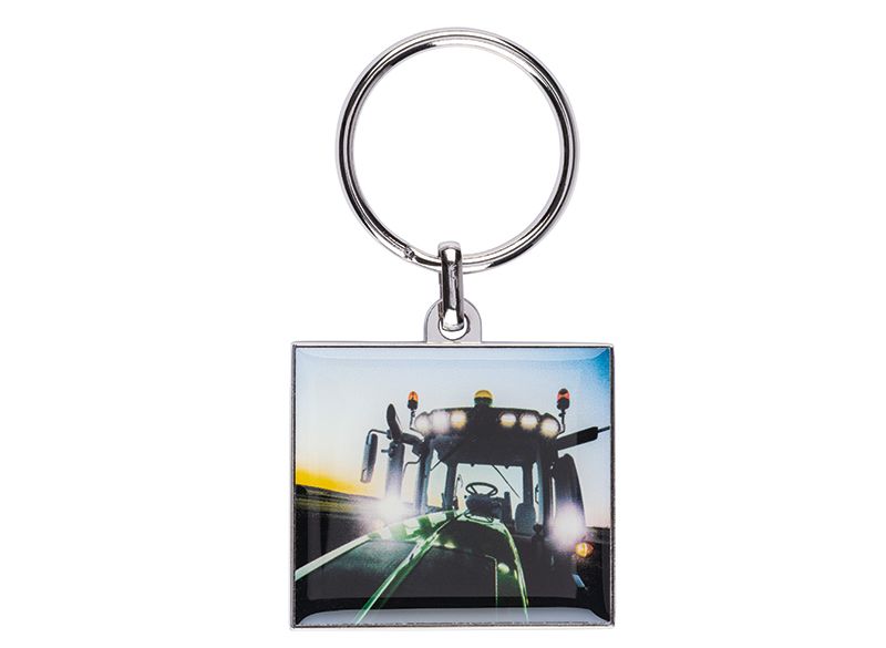 Přívěsek na klíče s fotografií a vyraženým logem John Deere na rezervě.