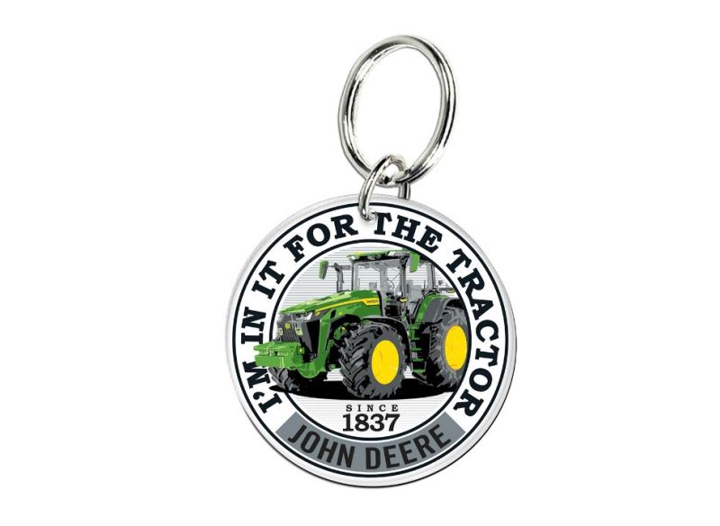 Přívěsek na klíče značky John Deere. Kruhový přívěsek na klíče s obrázkem traktoru 8R a nápisem "I´m in it for the tractor".
