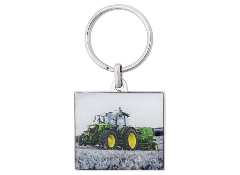 Přívěsek na klíče značky John Deere. Kruhový přívěsek na klíče s obrázkem traktoru 8R a nápisem "I´m in it for the tractor". Materiál: 100% akryl