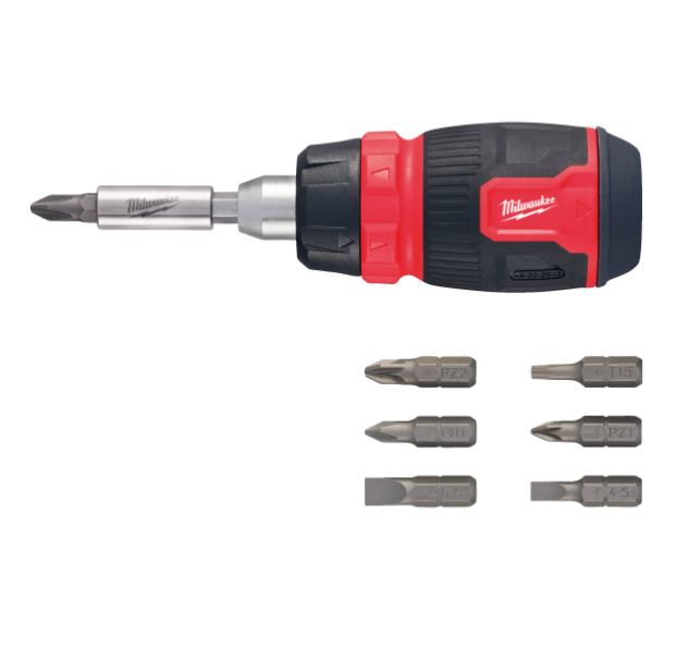 Šroubovák obsahuje následující bity: plochý 4,5, plochý 5,5, T15, PH1, PH2, PZ1 a PZ2.
