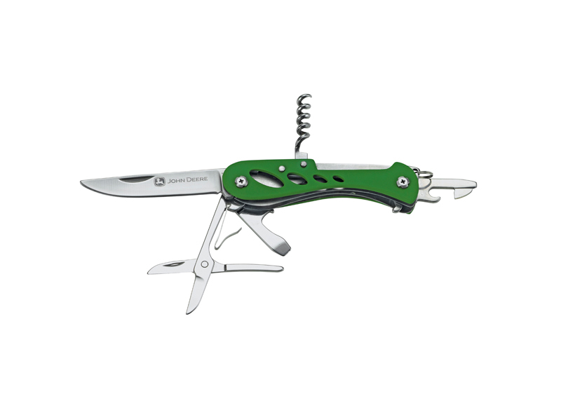 Multifunkční nůž vyroben z 2CR13 oceli.Hliníková střenka je na povrchu pogumovaná pro lepší manipulaci. K dispozici jsou následující funkce: nůž s uzamykacím systémem, otvírák láhví, nůžky, otvírák konzerv, 2 a 5 mm dlouhý plochý šroubovák, vývrtka, děrovač a připevňovač kroužků.