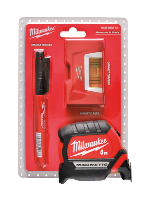 Sada ručního nářadí Milwaukee. Obsahující vodováhu, měřící pásmo a popisovač.