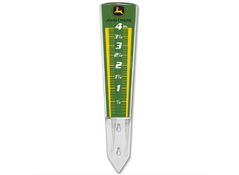 Srážkoměr s ochrannou známkou John Deere. Zelený a žlutý srážkoměr s černo-žlutým logem značky John Deere.