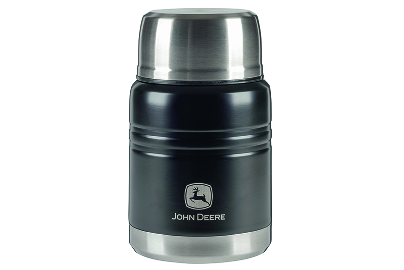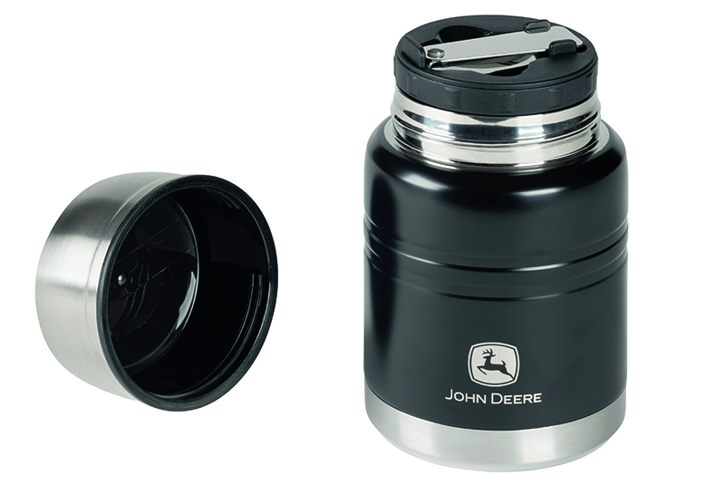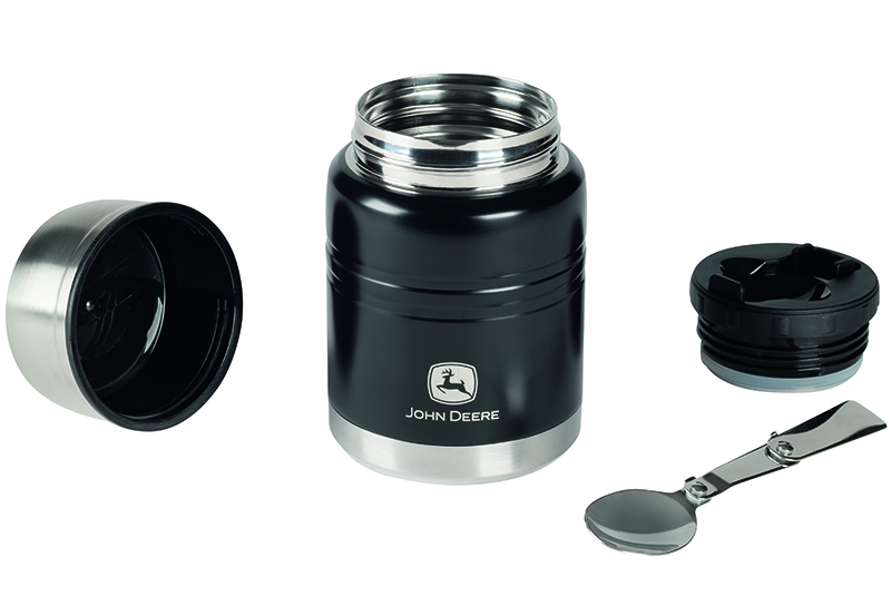 Izolovaná nádoba (nádoba s tepelnou izolací) na potraviny z nerezové oceli s dvojitou vakuovou izolací. Součástí je skládací lžička, která je uložena uvnitř víka. Vpředu je laserově vyryto logo John Deere.