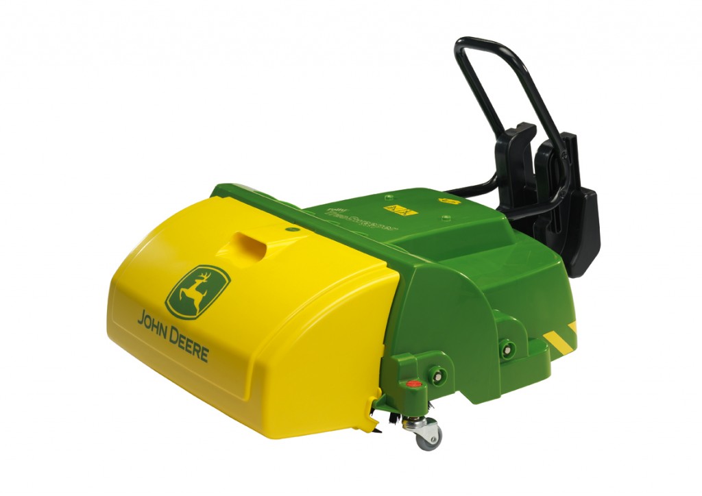 Plně funkční zametač s rotačním válcovým kartáčem. Sběrnou nádobu lze sundat a vyprázdnit. Nelze napojit na šlapací traktory rolly Kid s produktovým číslem začínající MCR02 a MCR01. Vpředu je logo John Deere.