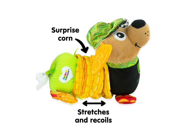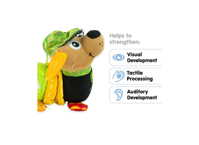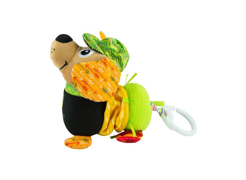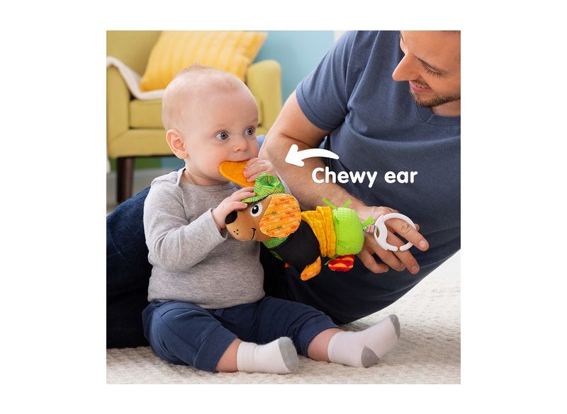 Lamaze vývojová hračka ve tvaru pejska je ideálním společníkem pro miminka od narození. Nabízí různé textury a šustící materiály, které podněcují smyslové vnímání a podporují hmatové zkoumání. Po zatažení za čumáček se pejsek zábavně prodlouží a poté opět zkrátí, což děti motivuje k opakovanému objevování. Měkké ouško slouží zároveň jako kousátko a pomáhá ulevit při prořezávání zoubků. Jasné barvy a kontrastní vzory přitahují dětskou pozornost a podporují rozvoj zraku. Díky praktickému klipu lze hračku snadno připevnit na kočárek, autosedačku nebo tašku na pleny, takže ji můžete mít neustále po ruce i na cestách. Tato hračka nejen baví, ale také přispívá k rozvoji jemné motoriky, koordinace pohybů a vytváření blízkého vztahu mezi dítětem a pečující osobou.