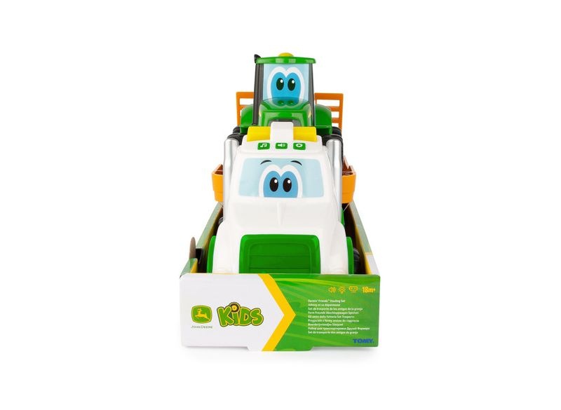 Pomozte svému malému dostat své farmářské přátele z práce do práce se sadou John Deere Lights & Sounds Farmin 'Friends Hauling Set! Tato zábavná farmářská dvojice obsahuje nákladní automobil s rampou, která se zvedá a spouští, což usnadňuje srolování traktoru na palubě. Nákladní vůz obsahuje světla a zvuky pro další zábavu během hraní a lze jej také použít k přepravě dalších vozidel Johnny Tractor. Obě hračky mají volná kolečka pro spoustu zábavy. Věk: 3+