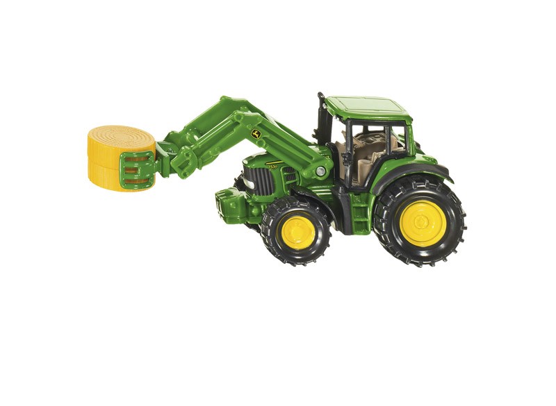 Model traktoru John Deere s čelním nakladačem a kleštěmi na balíky. Traktor je v měřítku 1:64 a je vyroben z kovu a plastových částí. Čelní nakladač s kleštěmi na balíky jsou pohyblivé. Balení obsahuje i jeden kulatý balík.