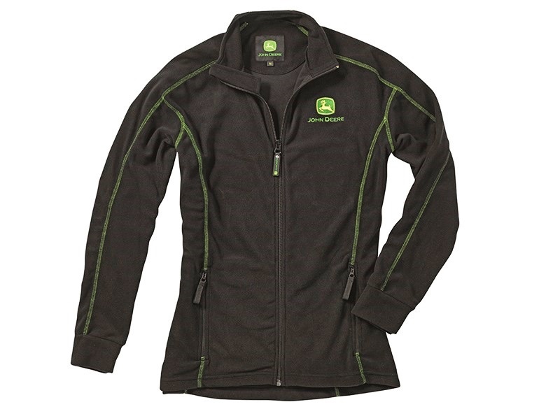 Mikrofleecová bunda John Deere v černé barvě, jejíž součástí jsou kontrastní švy. Na levém prsu je vyšité barevné logo John Deere. Bunda je lehká a teplá.