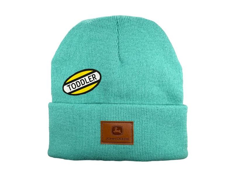 Dětská pletená čepice s koženou nášivkou s logem John Deere v barvě mint.