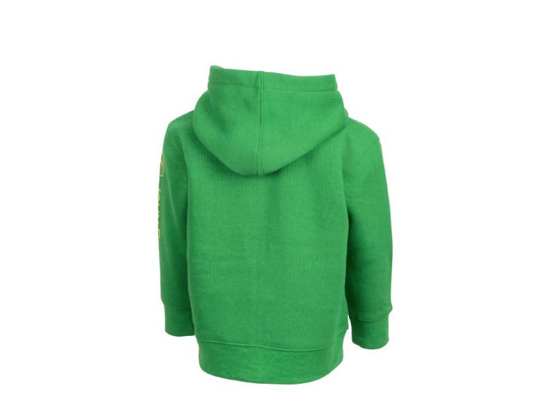 John Deere dětská zelená fleecová mikina s kapucí a sítotiskem loga na rukávu. Kolekce 2022.